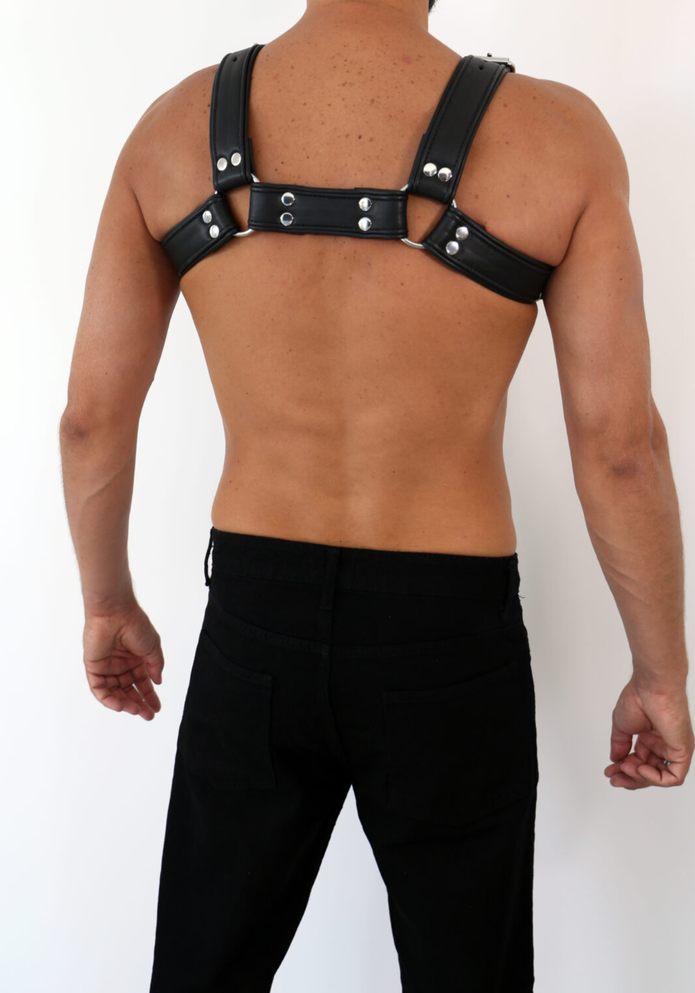 Wielkie srebrne pierścienie o średnicy 40 mm i 50 mm, solidne klamry (40 mm) oraz podwójne nity (12 mm) dopełniają całości, tworząc elegancki i wytrzymały design, który będzie idealnym dopełnieniem Twojego looku. Dzięki wielu opcjom regulacji, uprząż zapewnia perfekcyjne dopasowanie i pozwala zaprezentować Twoją klatkę piersiową w najlepszym możliwym świetle.