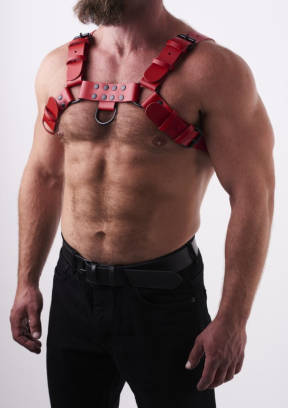 Czerwone pasy o szerokości 4 cm i grubości 3 mm zostały zaprojektowane, by zapewnić mocne wsparcie i jednocześnie subtelnie eksponować klatkę piersiową. Duże, czarne pierścienie, klamry i podwójne nity nadają całości solidności oraz charakteru. Dzięki licznym opcjom regulacji, Leather Chest Harness Red idealnie dopasowuje się do Twojego ciała.