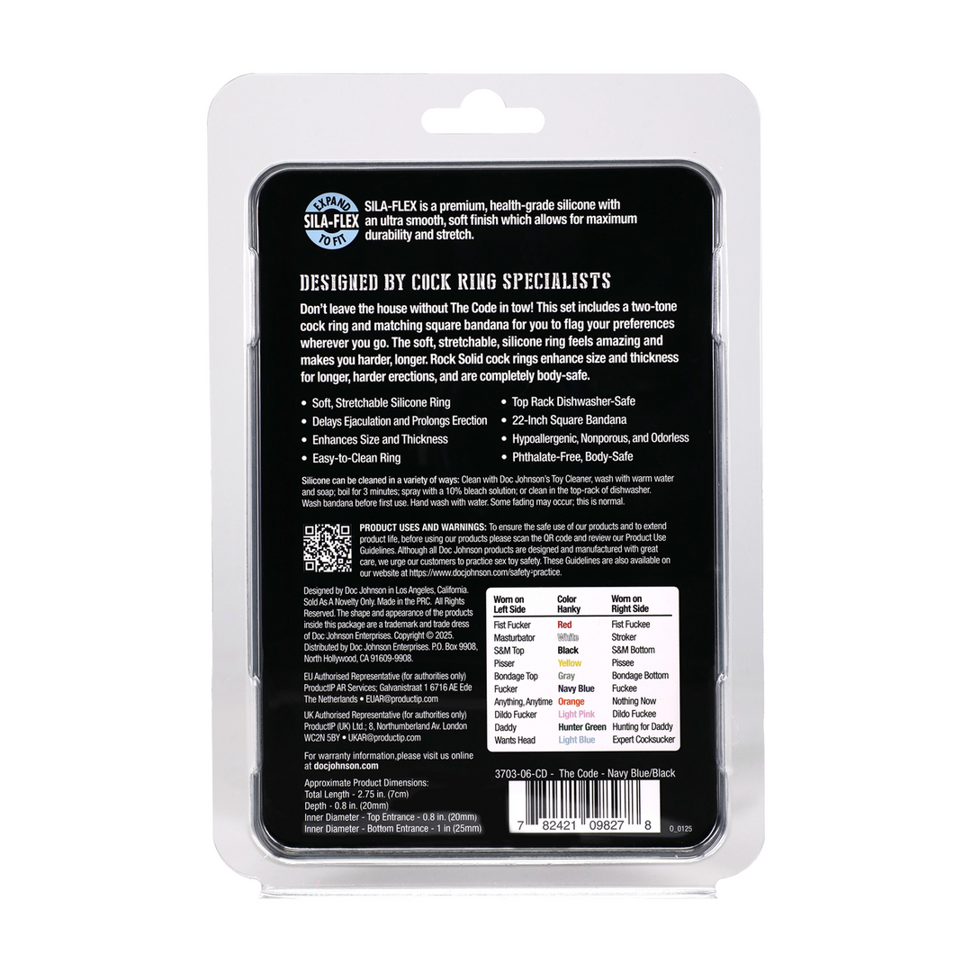 The Code Set to zestaw dwóch elementów: dwukolorowy pierścień erekcyjny i dopasowana bandana, aby pokazać swoje preferencje gdziekolwiek jesteś. Miękki, elastyczny silikon zapewnia większą twardość i dłuższą erekcję, a Rock Solid design wzmacnia rozmiar i grubość przy zachowaniu pełnego bezpieczeństwa dla ciała.